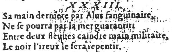 This is a quatrain that can appear to be clearly (now, in hindsight) about one thing, when it is actually about another thing. The two are no so much history mimicking itself, as much as it a statement about a soul possessed by evil. Here is the French of this quatrain, as well as the print representation:
