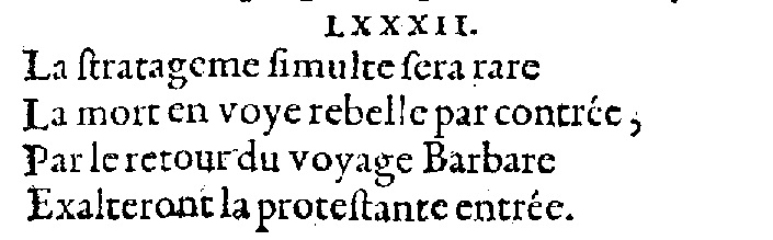 In this quatrain there are two uses of the word Malheureuse, one capitalized and one lower-case, with one written in the plural and one in the singular. Randal Cotgrave translated this word (in 1611, as the feminine spelling of malheureux) to mean, “unhappy, unlucky, unfortunate, sinister, cross, unprosperous, disasterous, miserable, and wretched.” The same translations are to be used for both; still, the website Wiktionnaire offers: “The one who is vile and contemptable,” along with an archaic meaning as “prostitute.” All implications of this one word are applicable.