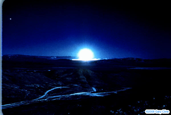 This may look like the moon rising at night, but it is an atomic bomb test made by the United States (the Trinity tests), prior to the atomic bombs being dropped on Japan, in World War II.