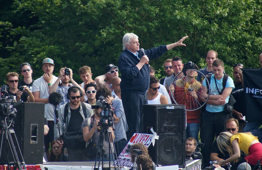 Aside Note: In five of the quatrains is written some form of the French word vert, which means (basically) “green.” In The Prophecies the use of colors is metaphor. For example, “white” refers to Christians and “black” refers to Muslims. The color “red” refers to atheists and “yellow” to polytheistic people of faith. Does that make “green” refer to California tree-huggers (those who paste posters of Regretta Thorninubung [now kidnapped by Jews]); or, does it refer to the lizard people my old professor and Icke said were here? While getting a picture of Icke from the Wiktionary artile on him, this picture and caption came up: