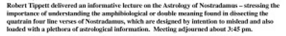 The points I tried to make in my three presentations about “The Astrology of Nostradamus” were never achieved, mostly because of ignorance in the listeners, indifferences in the listeners, or my inability to strike an invisible nail on the head, squarely. The third time I presented, it was to a small astrological group that was led by the only one who had a grasp of astrology, with everyone else a novice that just liked knowing an astrologer. By the time I tried to focus heavily on how astrology is a most amphibological language, everything went over their heads. The point that I failed to properly convey was how The Prophecies of Nostradamus was a language that must be compared to the language that astrology is. No one grasped that.
