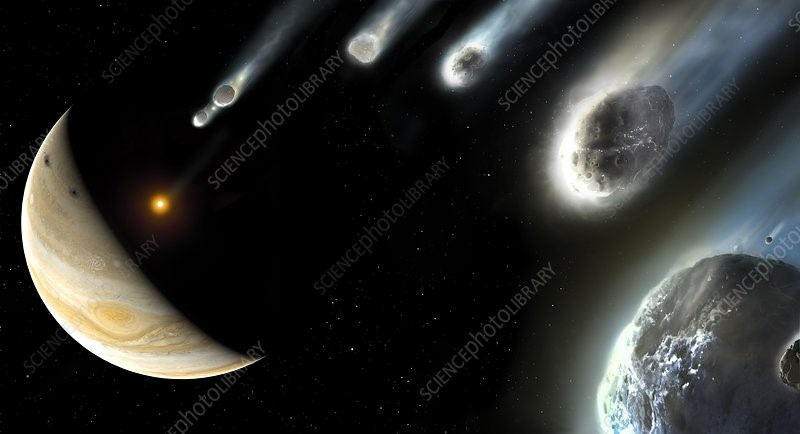 Comet Shoemaker Levy 9 broke into multiple pieces, each of which struck the planet Jupiter in July 1994.