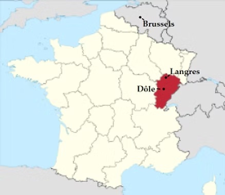 In line three we find “Brucelle,” with it separated by ampersand from “Dolle.”  The word “Dolle,” and the word “Langres,” both refer to communes in the Franche-Comté region of France.  It refers to Dôle, in the eastern Jura department, and Langres, in the Haute-Marne department, south of Belgium, bordering on Switzerland and just west of the French-German border.