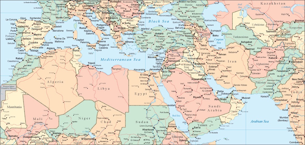 Okay, now that you have a picture drawn for you (feel free to use your own I-pod app and go to Google Maps), imagine that all the nations in Africa (the ones shown), all the ones in the Middle East (except Israel), and all the ones that used to get their toilet paper from the Soviets (Eastern Europe and the Russian states) hate Western Europe.  I know it is a stretch, but pretend.