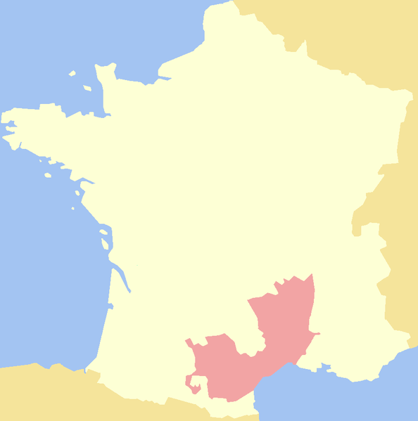 Toulouse is in the southwestern of France, in the regions that mesh together known as Languedoc-Roussillon and Midi-Pyrenees.  It was once the capitol of the historic province known as Languedoc, but it is now the capitol of the Midi-Pyrenees region.  The Midi-Pyrenees region has the Pyrenees Mountains as its southern border.  Notice the overlap in these diagrams.